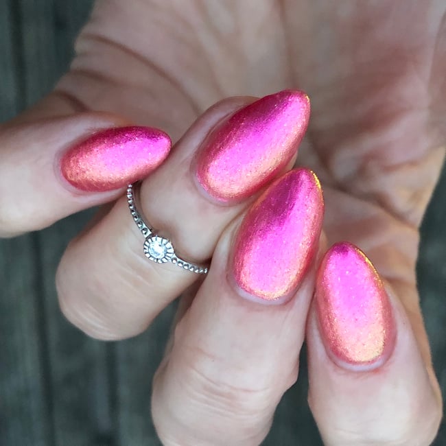 A unique multichrome that shifts from hot pink/coral/rose gold and a hint of green under different lighting, truly magical! πΈπ¦ π«